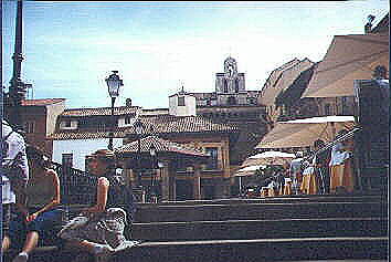 Wir sind immer noch allein und haben deshalb Zeit an allen Stellen stehn zu bleiben, die uns interessieren und keiner schreibt uns vo wie lange oder wie kurz wir das Pueblo Español besichtigen. Wie sind wir hierhergekommen? Natürlich mit dem Zug bis zur Plaza Catalunia und von dort mit dem Taxi (1000 Peseten) Man kann auch Bus und U-Bahn nehmen. Für 1 und 2 Personen ist das billiger. Für 3 Personen beisst es sich. Für 4 Personen ist am Ende das Taxi billiger und in jedem Fall bequemer. Ein Jeder nach seiner Fasson. Außerdem gibt es noch den Rundfahrtbus - oben offen wie in London - Der kostet 2350 Peseten inzwischen. Dafür kann man an jeder Sehenswürdigkeit aussteigen, zur Besichtigung schreiten und in irgendeinen späteren Bus wieder einsteigen und weiterfahren. Der Preis beinhaltet Eintrittspreisermäßigungen und es handelt sich um einer Tageskarte. Wenn man an einem Tag viel abmacht (Ruhrgebietsch), ist das auf jeden Fall lohnend. Wenn man nur 1 oder 2 Ziele ansteuert, ist es ein Rechenexempel. Der Eintritt zum Pueblo Espanol beträgt je Person 900 Peseten. Es gibt Familien und Gruppenrabatte. |