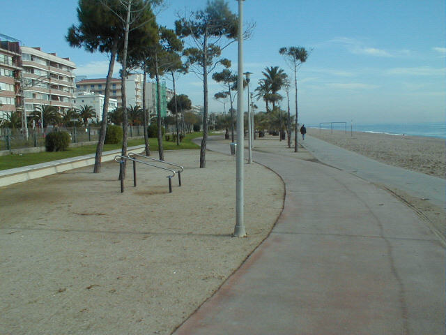 Einsame Strände, vereinsamte Hotels, dafür eine vorbildlich ausgebaute Strandpromenade mit Extra-Radweg und Fußweg, Am Bahnhof vorbei und an den Eigentumswohnungen der friedlichen Leute von Pineda. Kurz vor dem Friedhof sind bereits die Erschließungmaßnahmen für eine neue Einfamilienhaussiedlung erkennbar und das einschließlich einer Brunnenanlage mit Platz. |