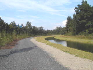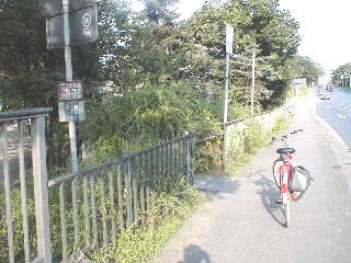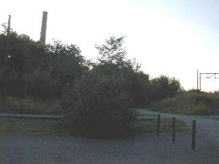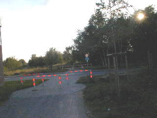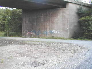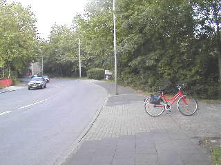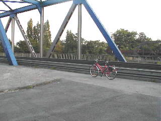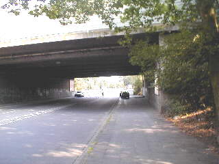 Hier fahren wir nach links bis es nicht mehr weiter geht. Unterwegs finden wir eine Brücke über den Bach die an einer Böschung endet. Da die Halde nicht abgetragen werden wird, kann es nur einen Grund für die Brücke geben: Der Polier wollte (mußte) in die Büsche und die waren nun einmal auf der anderen Bachseite oder so... oder anders... Wer weiß???? Auf jeden Fall fahren wir bis zum Ende und dort links unter der Brücke durch bis zur B 8. Wir sehen auf der anderen Straßenseite den Radweg fortgeführt. Da wir nicht fliegen können (Fahrbahn - Schiene - Zaun - Schiene - Fahrbahn aber kein Übergang, da ja der Autoverkehr nicht beeinträchtigt werden darf), fahren wir nach rechts bis zur Ampel an der Autobahnauffahrt. Nach längerer Wartezeit (wir sind mit dem Rad und nicht mit dem Auto) überqueren wir die B 8 |
