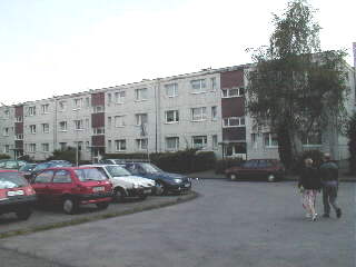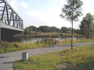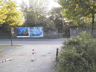 Auf der anderen Kanalseite sehen wir die Gemeinschaftsmüllverbrennungsanlage Oberhausen-Lirich, die in der Hauptsache von Oberhausen und Duisburg beschickt wird und in der Ferne grüßt bereits der Oberhausener Gasometer. Der Radweg endet geradeaus in einer Treppe und nach links auf einer Straße. Rechts liegt das Niederrheinstadion. Wir überqueren jedoch die Straße und fahren entlang dem Parkplatz, der zur OLGA errichtet wurde geradeaus weiter. Wir überqueren mehrere Straßen , bleiben aber immer auf dem Radweg, der hier als Emscherparkradweg ausgewiesen ist. An der Pommes(36) geht's zwar links schwenkt rechts aber trotzdem geradeaus weiter. |