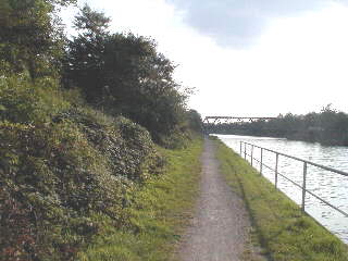 Wir erreichen schließlich die Pfingststr. (13) fahren nach links bis zur Brücke. Diese übequeren wir nach links und an der anderen Seite gehr links eine Treppe hinunter zum Kanalweg. |